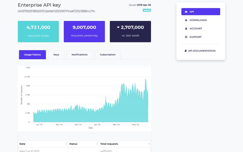 From your API dashboard you are able to manage your keys, watch your API usage in real-time and analyze its historical trends. You may also setup email alerts whenever you go near or over your daily quota.